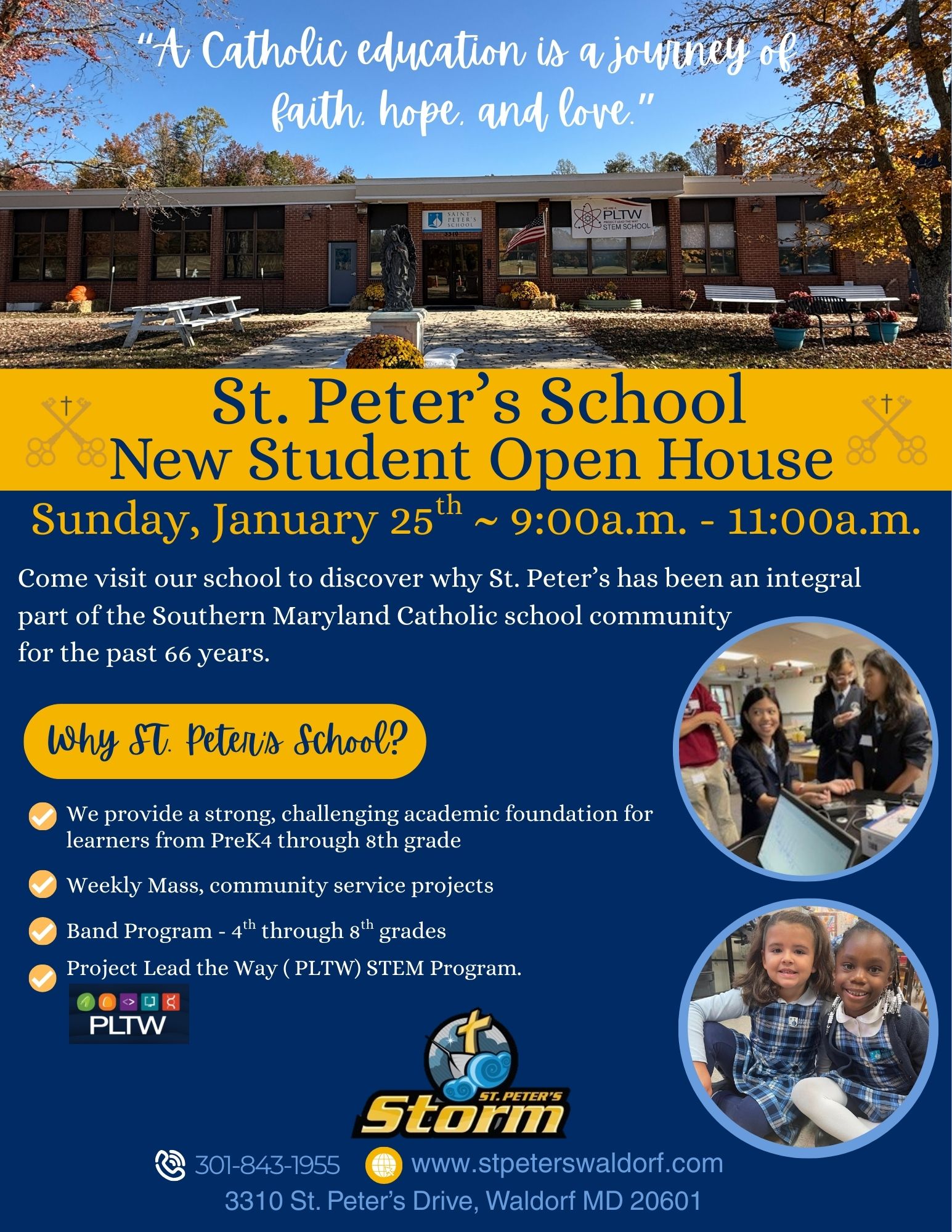 St. Peter’s School was established by Rev. Henry Sank in 1956 as the first Catholic school in Southern Maryland that was never racially segregated. Located in Waldorf, MD, our school cultivates spiritual growth and academic excellence by anchoring our students in Christian virtues. As a ministry of St. Peter’s Church, all aspects of our school are faithful to Jesus Christ and the teachings of the Catholic Church. Classes are currently offered for pre-kindergarten through eighth grade students.